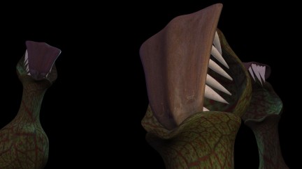 With this project, I wanted to try integrating text in an environment. This is my first attempt at nurbs modeling and the final version features both polygonal and nurbs modeling techniques. To begin the process, I decided to create an evnivonrment with a carnivorous plant theme. I based the design of the plants on the Nepenthes (also known as the “Pitcher” plant). After making preliminary sketches, I modeled the plants and imported text from Illustrator and converted it into three dimensional forms. The font is called Insectia, and I chose it because of the visual and conceptual connections to the insect eating plants. After texturing and lighting the scene, I animated the plants and added some additional camera movement to create a more immersive sense of space.
